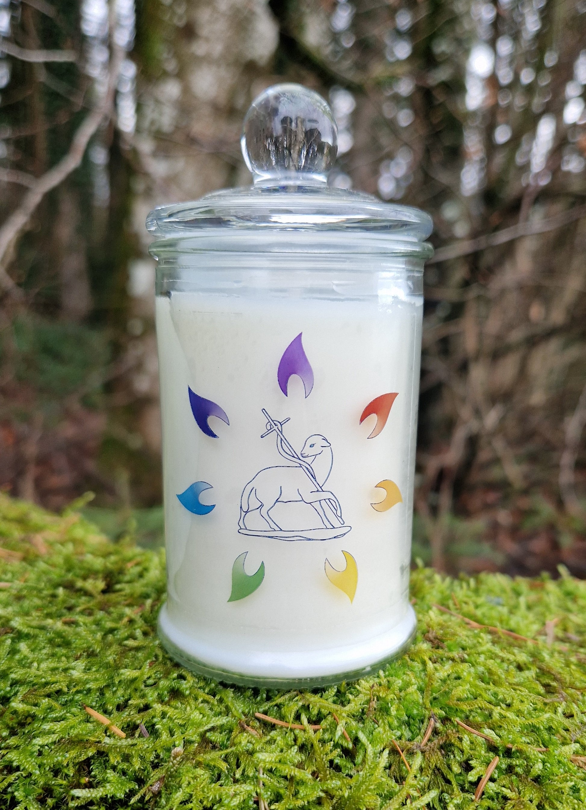 Photophore en verre avec sceau de l’École Essénienne. La bougie est en cire de colza biologique. Le photophore est réutilisable en y plaçant, par exemple, une bougie à réchaud. Combustion 25 heures.