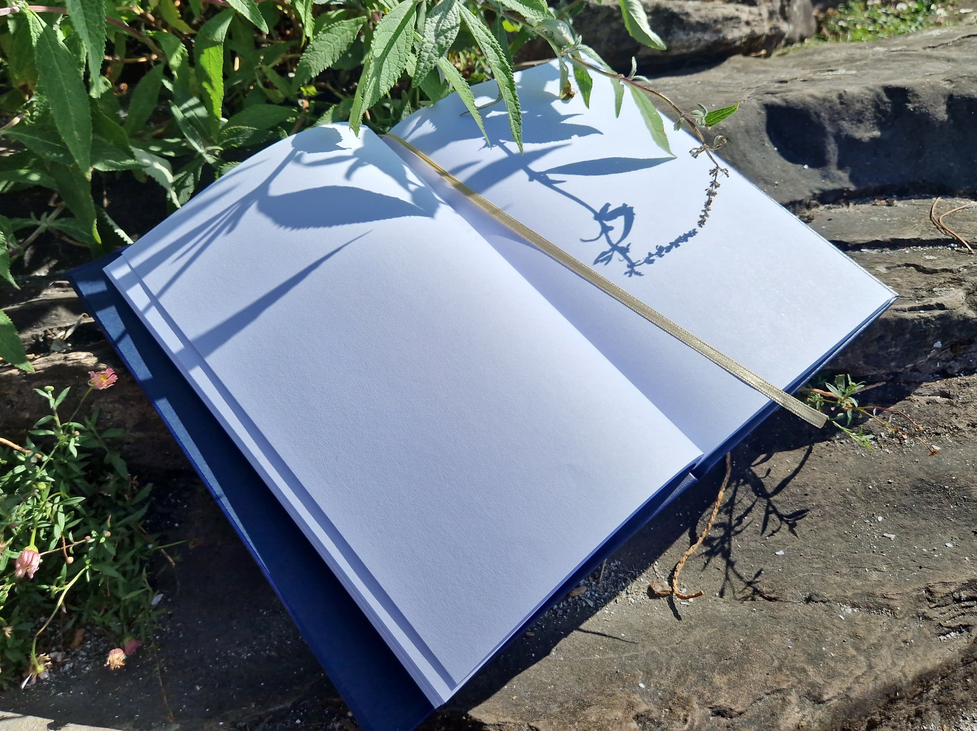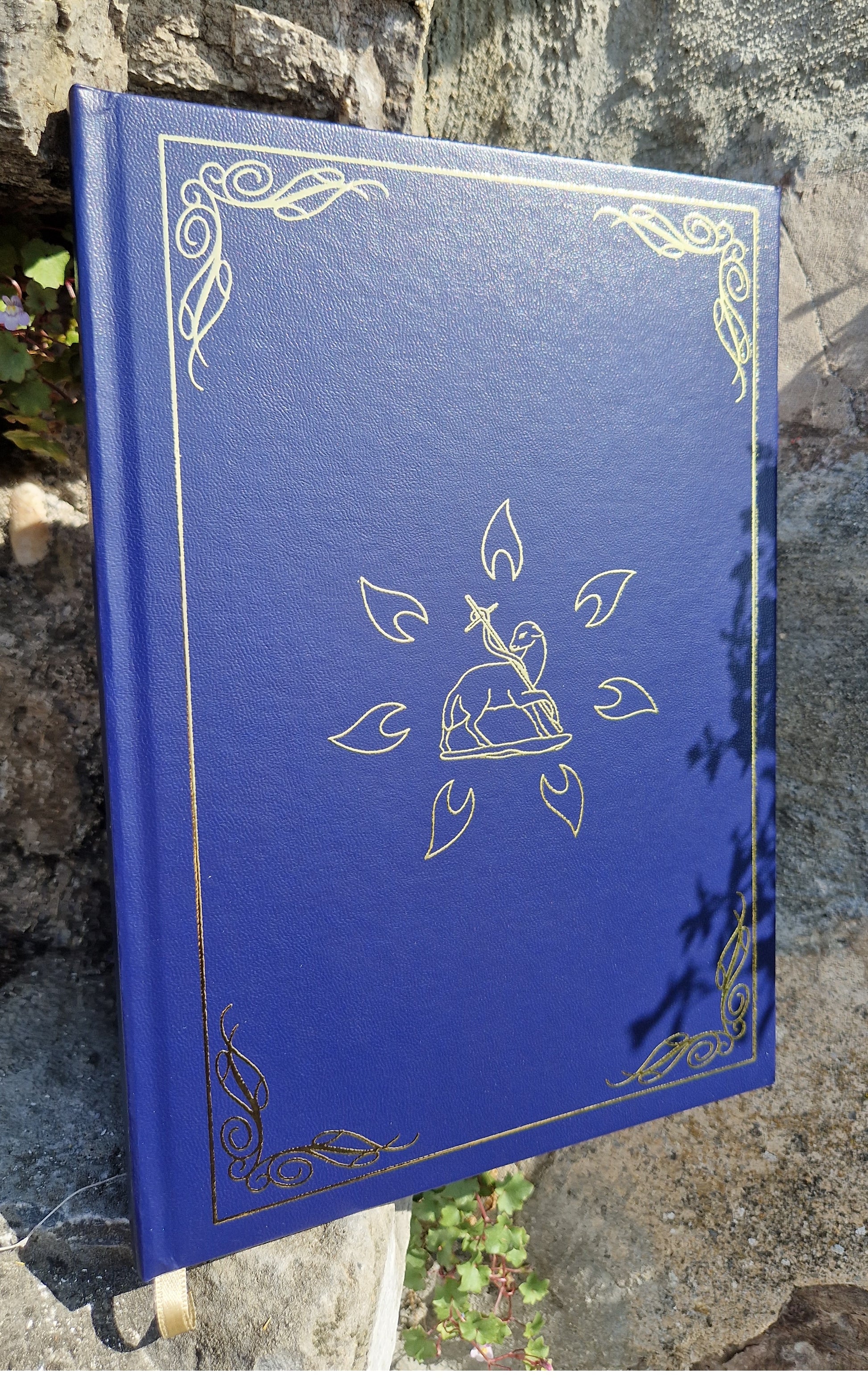 Cahier d’écriture bleu roi avec le sceau de l’École Essénienne incrusté en doré et signet doré de 80 pages. Dimension 17,5 x 24x5