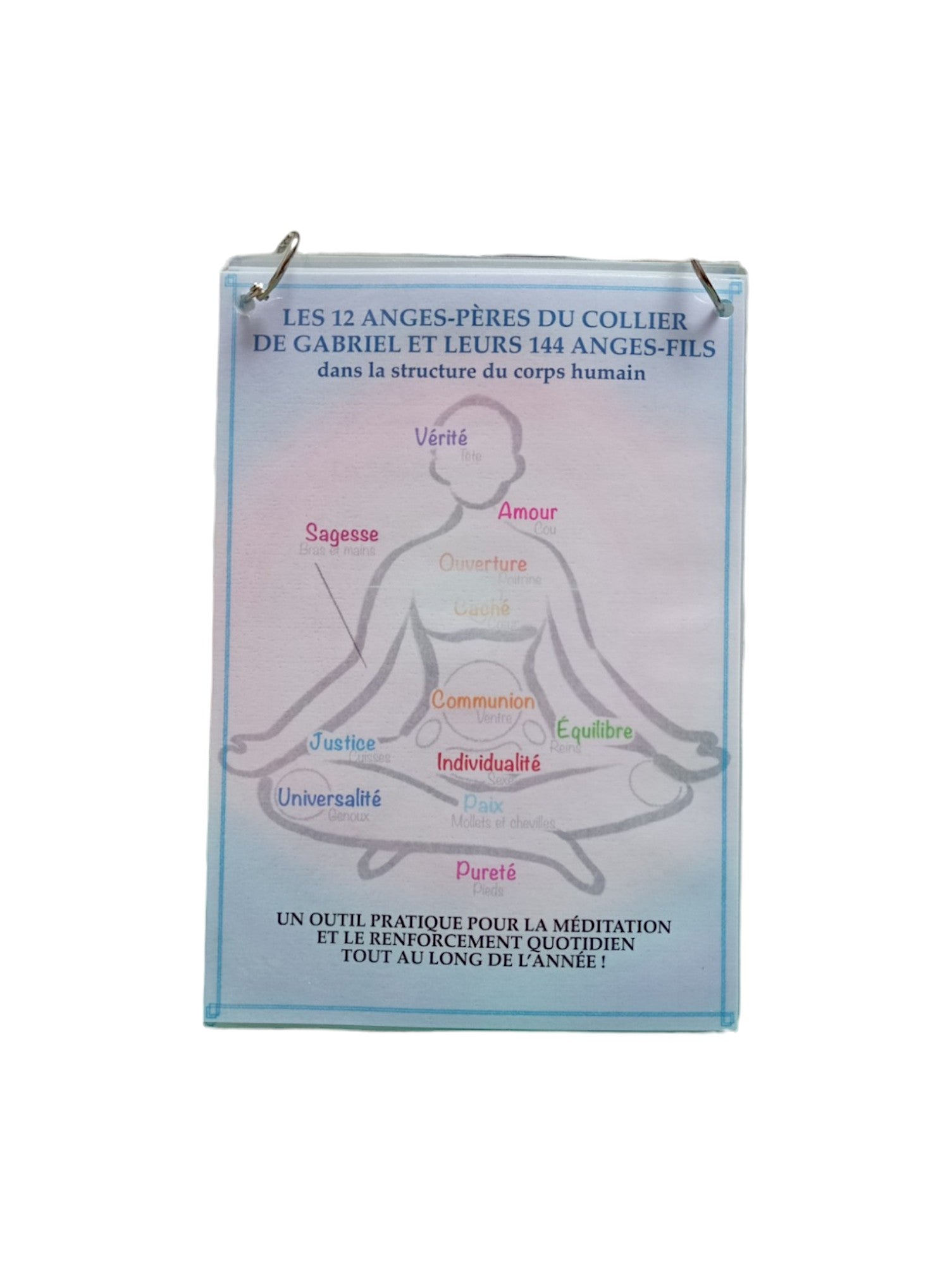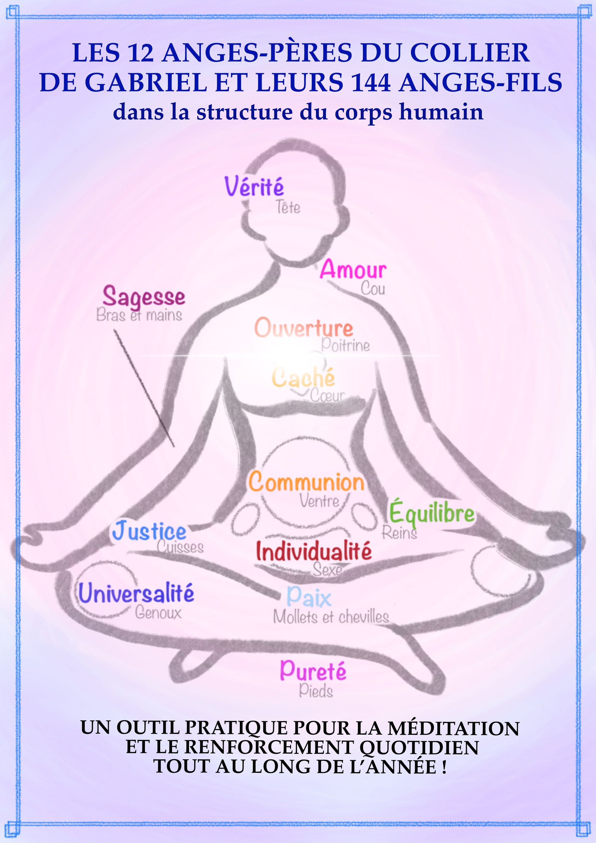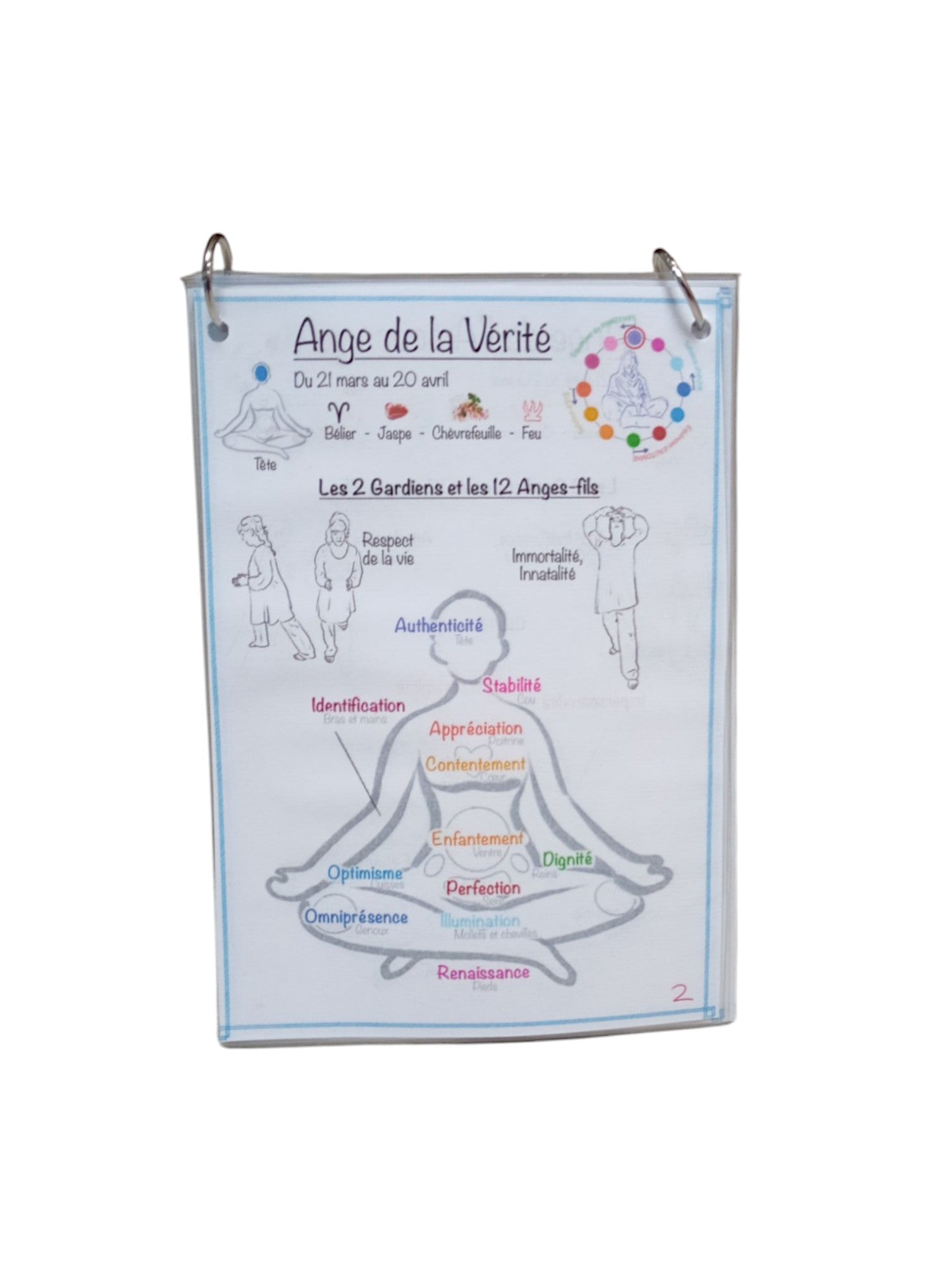 Tu trouveras dans ce livret les mouvements des 2 gardiens, les 2 vertus complémentaires de chaque Ange Père. Chaque mouvement peut être réalisé dans la période de l'Ange ou tout au long de l'année pour approfondir ton lien avec la vertu.