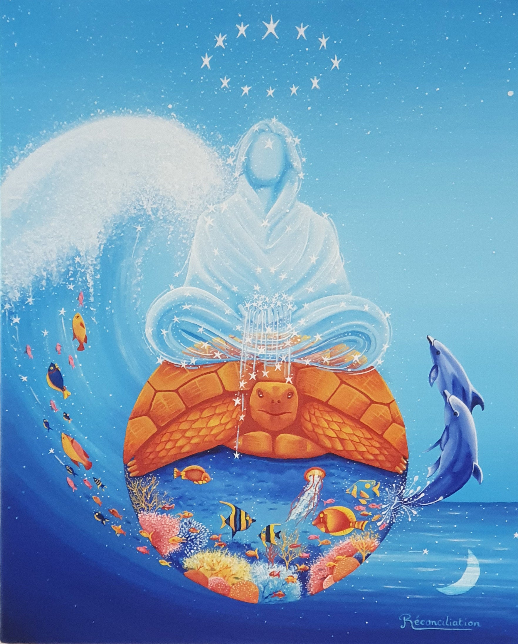 L’Archange Gabriel, Archange de l’Eau est représenté assis sur la tortue, laquelle représente la Terre, qui en dessous de sa carapace en apparence dure, porte en elle un Être, ô combien Vivant et ainsi protégé. L’Archange Gabriel, le monde de l’Eau, l’Eau que nous portons et l’Eau qui nous entoure, si sensible à la lune et à ses influences.